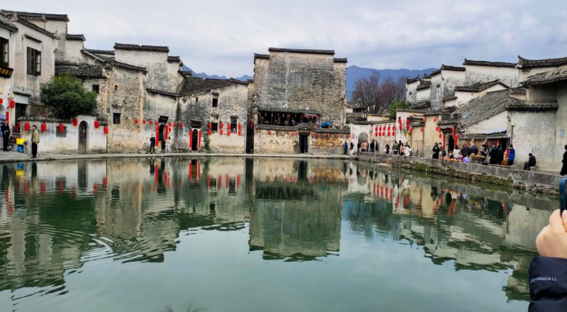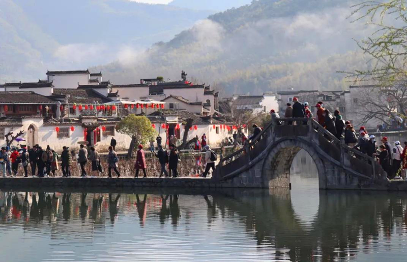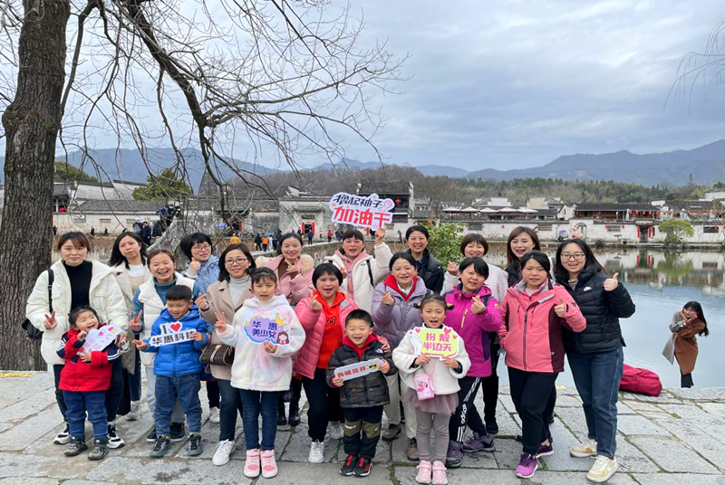 “無(wú)邊細(xì)雨濕春泥,隔霧時(shí)聞小鳥(niǎo)啼。楊柳含顰桃?guī)?,一邊吟過(guò)畫(huà)橋西。”宏村的魅力是那些極具代表性的徽派建筑,古木窗欞,湖水清蓮,拱橋如虹,華惠女工們徜徉在這綿延的青磚古巷中,感受著徽州文化的博大精深。